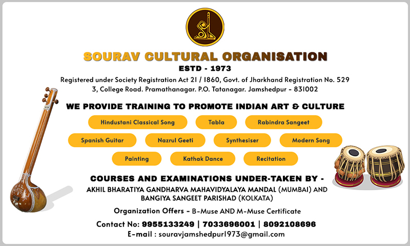 More than 51 years ago a group of culture-minded young persons of Pramathanagar, Parsudih area situated in the extreme south of Jamshedpur Steel City ( Jharkhand ) dreamt a dream of an ideal institution of music, art and culture in their dwelling area and as a result of their indomitable will force and modest endeavour, was born SOURAV on 31st of January 1973, Under the valued guidance of the eminent and erudite personalities of Jamshedpur with the aims and objectives to promote and propagate music, art and culture in the locality and consequent upon the concerted, diligent and untiring efforts of those few founder members, Sourav has much earlier scored a colourful name as the pioneering organisation of its kind in the vast area greater Jamshedpur and it’s areas as well.